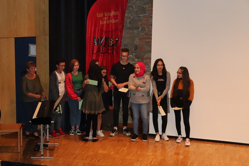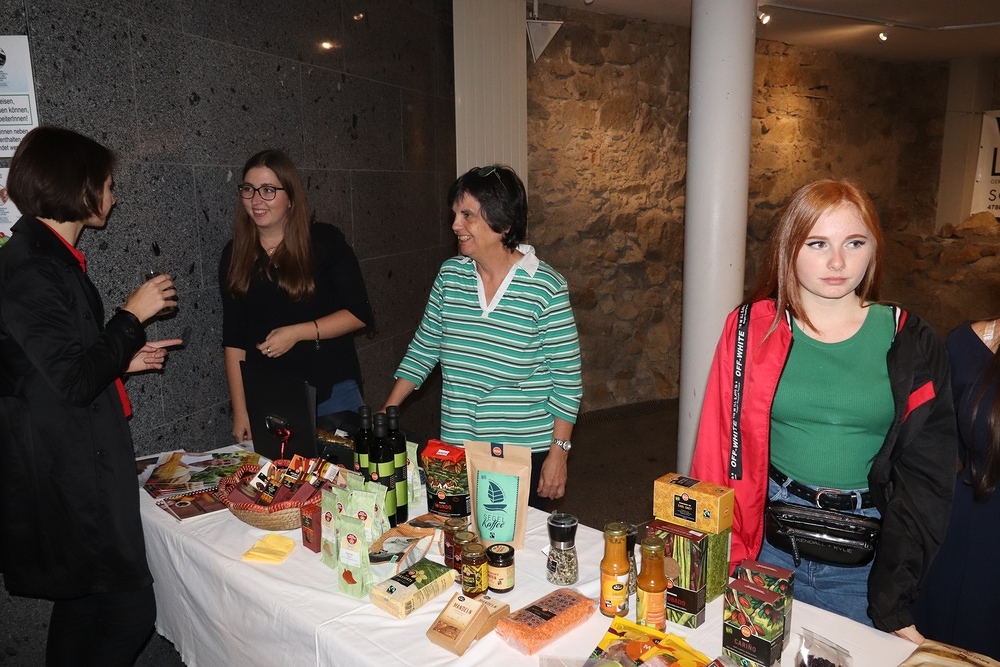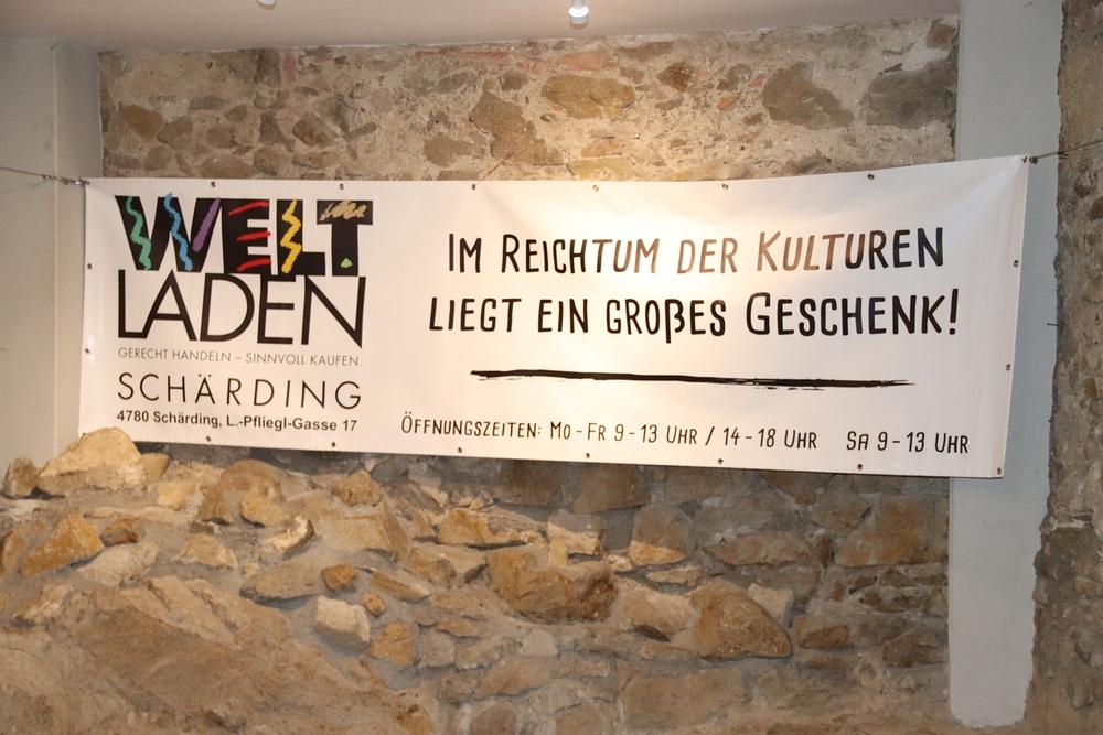 SchülerInnen und Eltern der Neuen Mittelschule Schärding boten in der Pause Kostproben aus ihrem internationalen Kochbuch an. Köstlichkeiten aus Fairem Handel gab es vom Weltladen Schärding.